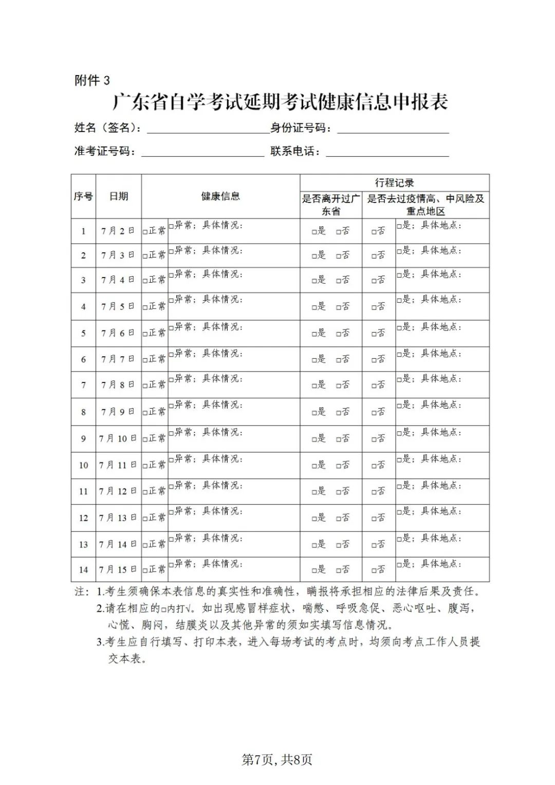 附件3.广东省自学考试延期考试健康信息申报表