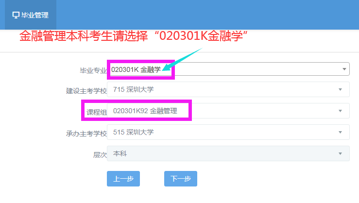 1、点击毕业申请→选择专业(020301K金融学),选择主考学校(深圳大学),选择课程组(金融管理)→下一步→核对前置学历信息→点下一步→点下一步→点毕业申请→选办理地点(在深圳提交毕业材料的考生,选择“深圳市区”)→点击申请。