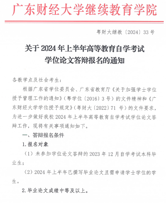 [广财]关于2024年上半年自考学位论文答辩报名的通知