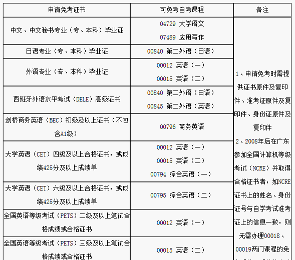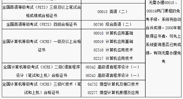 提醒:2008年后在广东参加全国计算机等级考试(NCRE)并取得合格证书者,如NCRE证书上的姓名、身份证号与自学考试准考证上的信息一致,则无需办理00018、00019两门课程的免考手续,系统将自动合并成绩。但目前有部分考生因个人信息不一致或者拥有多个自学考试准考证号导致成绩无法合并到省自学考试管理系统,考生如需办理毕业申请须及时办理免考手续,免考手续办理
