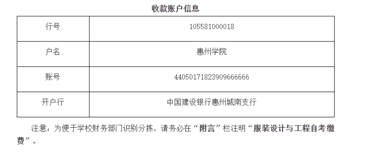2、缴款方式及确认考试资格:一律采用电子汇款方式缴款。(费用在4月30日前汇入惠州学院财务处账户)。